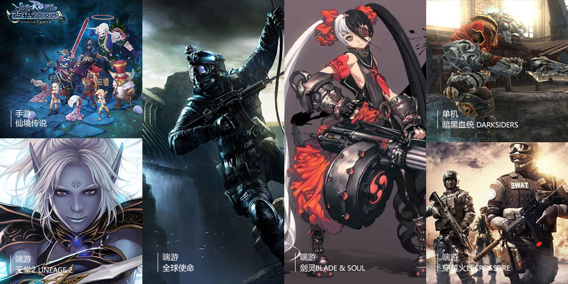 《穿越火线》、《天堂2》、《地狱之门》、《暗黑血统》、《全球使命》、《战争机器资料篇》、《剑灵》等项目。
